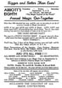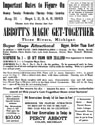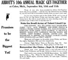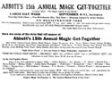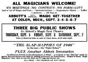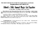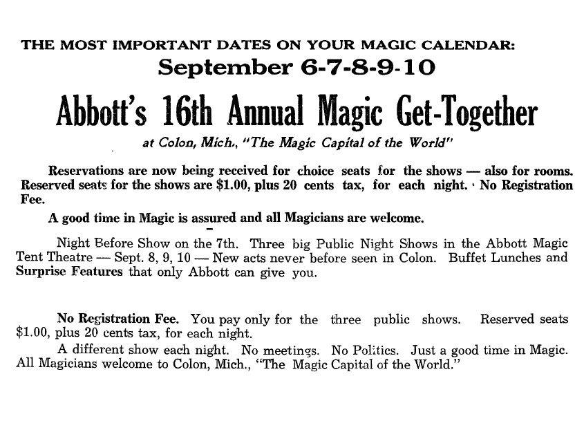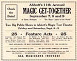 Welcome to the Magic Capital of the World. Abbott's Magic mission is simple: to provide the best magic products and service to our customers at the lowest prices possible. We take great pride in our company (which has been doing business since 1934), our commitment to customer service and in the products we sell. Our online store is designed to provide you with a safe and secure environment to browse our product catalog. The Abbott plant provides year round employment for our staff. More than 50,000 square feet is divided into the following departments: Business Offices, Printing Department, Art Department, Silk Dyeing, Computer Room, Sewing Assembly, Silk Screen Processing, Blacksmith Shop, Lathe, and Precision Metal Work, Plastic and Chemicals, Metal Casting, Tool and Die Making, Shipping, Experimental, Wood Working, Sheet Metal Shop, Stock Room, Paint Shop, Showrooms, Demonstration Stage and Magic Theatre. Our phenomenal success proves that we are the recognized leaders in magic - not only in America but the entire world. We are credited with instituting real and modern innovations for the benefit of buyers of magical apparatus - proof enough of our sincerity in wanting to give those buyers a fair deal always. Our factory facilities are such that we are in the position to make anything in magic. Also we own our factory buildings - the only buildings in the world designed for the sole purpose of manufacturing magic. Abbott's leads the entire magic field in producing original magic effects. To us, your first order is the beginning of a lasting friendship in magic. Abbotts is the publisher of Tops Magazine (30's - 50's), New Tops Magazine (60's - 90's), and most recently our free online version the Newest Tops Magazine with informative articles by some of todays top magic performers. Abbotts Magic Shop and Abbotts Magic Get Together have been in business since 1934. Annual events include the Closeup Magic Convention, Summer Magic shows at the Abbott magic plant, a 4 day Magic Convention in August aka Magic Get Together, and Magic Flea Market and Auction. The Magic Get Together magic convention is well over 70 years old and has had many of the worlds greatest magicians perform on its magic stage including Blackstone Sr, Blackstone Jr, Karrell Fox, Lance Burton, Mac King, Jeff McBride, Jeff Hobson, Harlan Tarbell,Cardini, Neil Foster, and about 900 more. Publications include Tops Magic Magazine, Abbotts Illusions, Colon MI aka the Magic Capital of the World, Abbott Magic Movies, Abbott's Magic Compendium, and Abbott's Magic Catalog which includes thousands of magic tricks, magic books, and magic illusions for magicians of all ages and all magician skill levels including beginner magician and professional magician. Abbott's believes that this website, www.magicgettogether.com, is the largest magic site dealing with a magic conventions in the world.