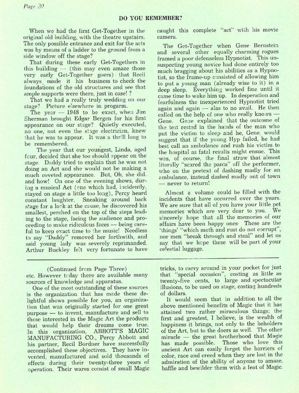 Welcome to the Magic Capital of the World. Abbott's Magic mission is simple: to provide the best magic products and service to our customers at the lowest prices possible. We take great pride in our company (which has been doing business since 1934), our commitment to customer service and in the products we sell. Our online store is designed to provide you with a safe and secure environment to browse our product catalog. The Abbott plant provides year round employment for our staff. More than 50,000 square feet is divided into the following departments: Business Offices, Printing Department, Art Department, Silk Dyeing, Computer Room, Sewing Assembly, Silk Screen Processing, Blacksmith Shop, Lathe, and Precision Metal Work, Plastic and Chemicals, Metal Casting, Tool and Die Making, Shipping, Experimental, Wood Working, Sheet Metal Shop, Stock Room, Paint Shop, Showrooms, Demonstration Stage and Magic Theatre. Our phenomenal success proves that we are the recognized leaders in magic - not only in America but the entire world. We are credited with instituting real and modern innovations for the benefit of buyers of magical apparatus - proof enough of our sincerity in wanting to give those buyers a fair deal always. Our factory facilities are such that we are in the position to make anything in magic. Also we own our factory buildings - the only buildings in the world designed for the sole purpose of manufacturing magic. Abbott's leads the entire magic field in producing original magic effects. To us, your first order is the beginning of a lasting friendship in magic. Abbotts is the publisher of Tops Magazine (30's - 50's), New Tops Magazine (60's - 90's), and most recently our free online version the Newest Tops Magazine with informative articles by some of todays top magic performers. Abbotts Magic Shop and Abbotts Magic Get Together have been in business since 1934. Annual events include the Closeup Magic Convention, Summer Magic shows at the Abbott magic plant, a 4 day Magic Convention in August aka Magic Get Together, and Magic Flea Market and Auction. The Magic Get Together magic convention is well over 70 years old and has had many of the worlds greatest magicians perform on its magic stage including Blackstone Sr, Blackstone Jr, Karrell Fox, Lance Burton, Mac King, Jeff McBride, Jeff Hobson, Harlan Tarbell,Cardini, Neil Foster, and about 900 more. Publications include Tops Magic Magazine, Abbotts Illusions, Colon MI aka the Magic Capital of the World, Abbott Magic Movies, Abbott's Magic Compendium, and Abbott's Magic Catalog which includes thousands of magic tricks, magic books, and magic illusions for magicians of all ages and all magician skill levels including beginner magician and professional magician. Abbott's believes that this website, www.magicgettogether.com, is the largest magic site dealing with a magic conventions in the world. To keep up with the latest at Abbott's be sure to sign up for our newsletter and visit our other sites - Abbott Magic Shop, Newest Tops Magazine. Abbott Closeup Convention, Abbott Flea Market